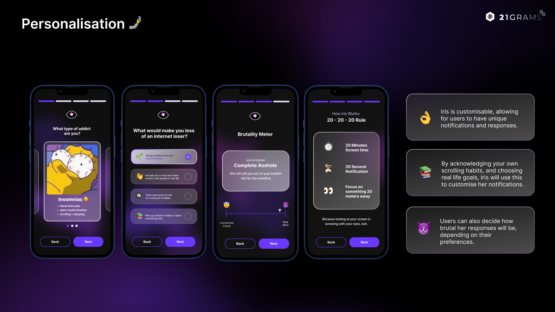 The 'Iris' app employs API technology to trigger notifications when users are active on social media platforms, delivering candid reminders to halt scrolling. By tapping into Gen Z's penchant for humour and self-awareness, 'Iris' seamlessly integrates direct messaging into their daily routines, effectively curbing screen time and mitigating the risk of myopia.